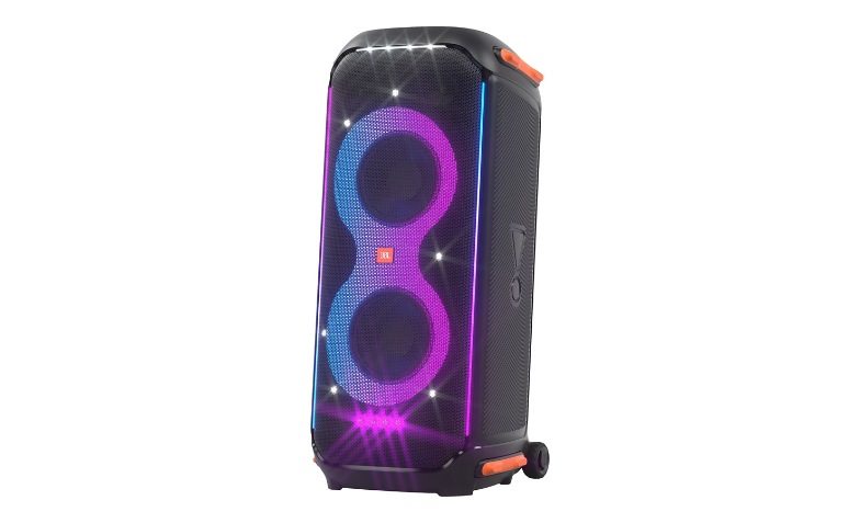 The JBL Partybox 710 is a powerful portable party speaker with 800W RMS of JBL Original Pro Sound, featuring dual 8-inch woofers and 2.75-inch tweeters, a frequency response of 35 Hz to 20 kHz, and various connectivity options including Bluetooth 5.1. It also boasts a dynamic lightshow, IPX4 splashproof design, and a portable form factor with wheels and an easy-grip handle.